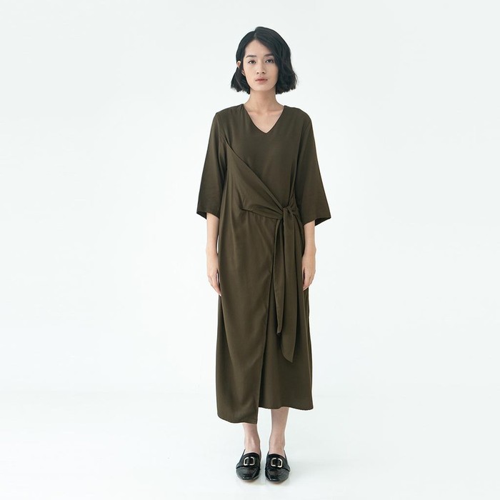 Kalau mau tampilan inner abaya yang beda, InKano punya Gianna dress yang cantik dengan kerah V-neck dan front self tie knot. Gaun ini menggunakan material katun dan rayon premium yang breathable. Tersedia dalam warna basic yang menarik, termasuk Offwhite, Black, dan Olive.