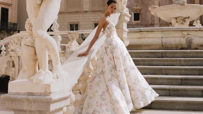 Motif klasik ini masih akan populer di sepanjang tahun 2023. Bedanya adalah ukuran motif bunga yang jauh lebih besar dan menghiasi seluruh bagian gaun pengantin.