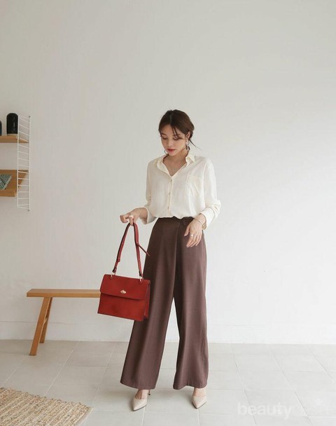 Untuk gaya yang lebih formal, kamu bisa memadukan high waist kulot dengan kemeja. pilih warna-warna netral atau warna pastel agar tampilan kamu terlihat elegan dan menarik.