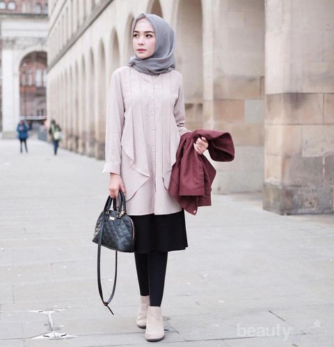 Warna netral memang paling cocok kalau dipadukan dengan warna netral, seperti tampilan satu ini. Perpaduan hijab abu-abu dan terusan warna biru ini bikin