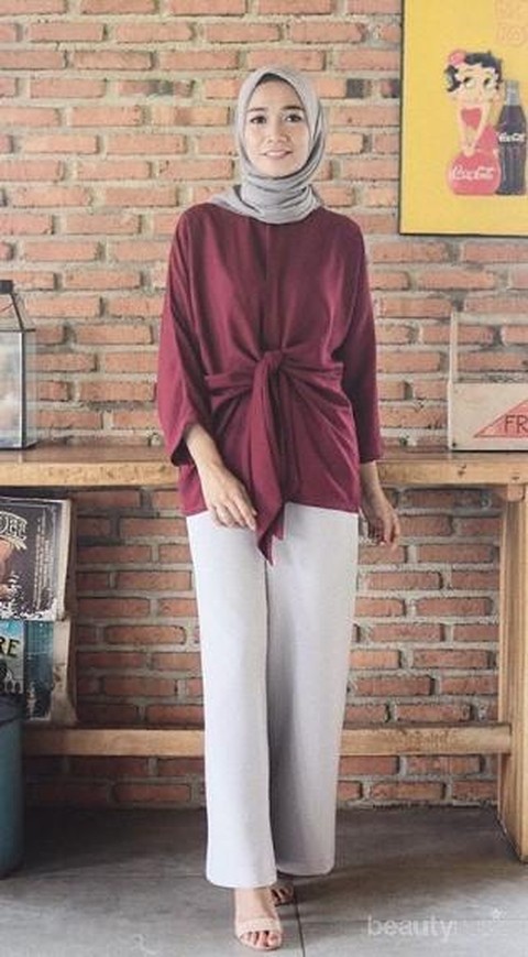 Pengen tampilan yang lebih berwarna? Jangan khawatir, hijab warna abu-abu masih bisa kamu padukan dengan warna merah maroon loh. Misalnya seperti look yang ada di atas ini. Perpaduan maroon dan abu-abu akan menunjukkan kesan feminim yang maksimal. Tampilan ini juga terlihat ringan tapi formal,