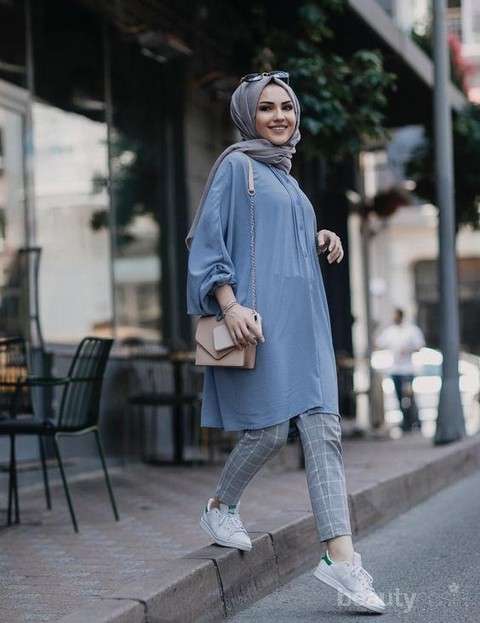 ladies. Coba deh cari terusan warna biru yang panjangnya mencapai paha, lalu padukan dengan celana panjang