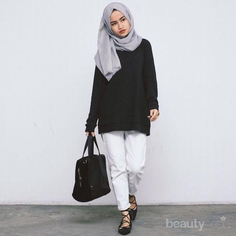 Enggak ada yang salah loh kalau kamu memadukan warna hitam dan putih dengan hijab berwarna abu-abu.