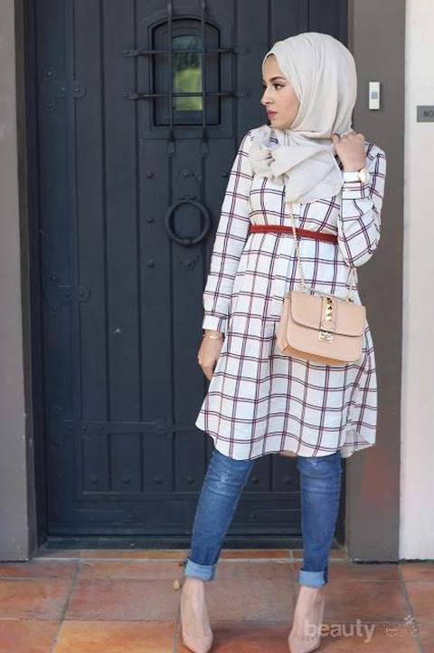 Ladies, sempurnakan penampilan kamu dengan tampilan fashion hijab casual tunik kemeja kotak-kotak dengan panjang hingga di atas lutut kak seperti inspirasi berikut ini. Padu padankan juga dengan celana jeans berwarna biru dan sepatu