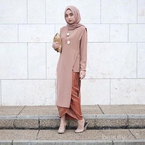 Busana hijab moderen busana tunik tidak hanya bisa dipakai untuk penampilan casual saja lho, kamu bisa mengenakan busana ini untuk tampilan formal seperti fashion hijab untuk kondangan. Seperti inspirasi berikut ini ladies. Kombinasi antara tradisional pada kain batik dan moderen pada tuniknya menjadi satu kesatuan busana yang menarik untuk baju kondangan bukan. Untuk model hijab dan warna hijab bisa kamu sesuaikan dengan model hijab simple. Jangan lupa untuk memakai