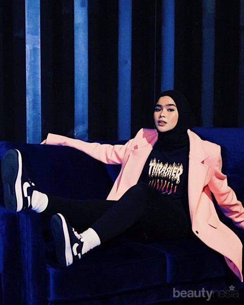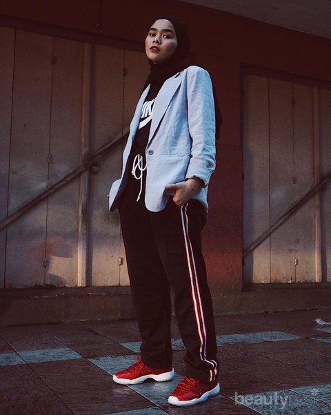 Selain full black style , kamu bisa kok memadukan warna gelap seperti hitam dan biru tua dengan warna merah muda seperti yang dilakukan oleh Sivia. Walaupun warna hitam lebih mendominasi, namun ia membuat gebrakan dengan mengenakan blazer pink yang membuat tampilannya on point dan tak lupa hijab style pashmina andalannya. Kalau kamu pengen kelihatan boyish, kamu bisa mengenakan sneakers seperti yang dikenakan oleh Sivia. Namun jika kamu ingin terlihat lebih formal, kamu bisa coba mengenakan high heels atau flat shoes dengan warna senada.