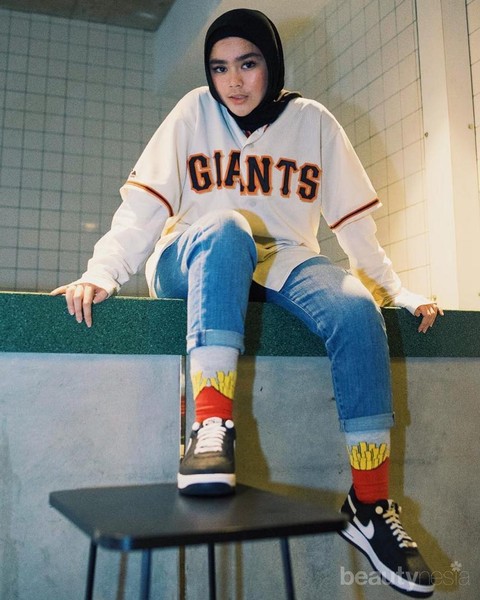 Mengenakan hijab tak berarti kamu cuma bisa mengambil baju dengan suasana muslim saja. Terbukti, dengan mengenakan baseball shirt kamu bisa mengkreasikannya menjadi gaya berpakaian muslimah, seperti yang dikenakan oleh Sivia yang satu ini. Ia terlihat boyish dan casual hanya dengan baju baseball dan jogger pants berwarna cokelat.