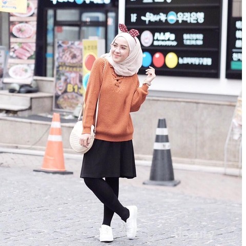 Padu padan outfit hijab legging dengan sweater kesayangan akan terlihat lebih sopan jika dipadukan dengan rok ataupun midi dress yang cantik. Terlihat lebih stylish juga bukan?