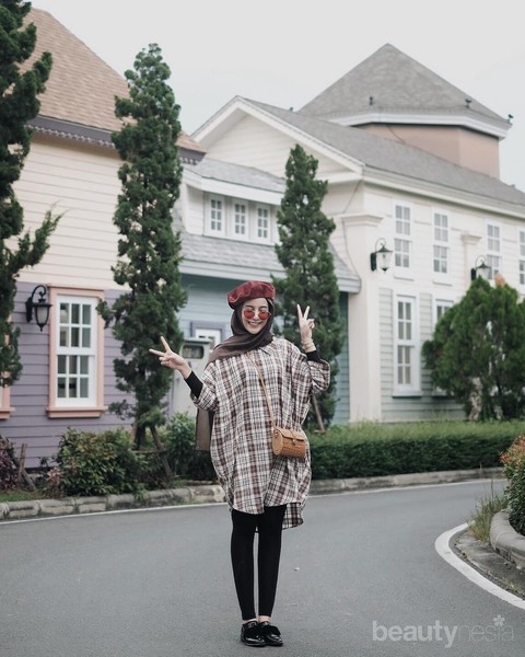 Padu padan outfit hijab legging dengan oversized tartan top bisa menjadi inspirasi busana berliburmu. Agar nyaman, kenakan pula flat shoes andalanmu!