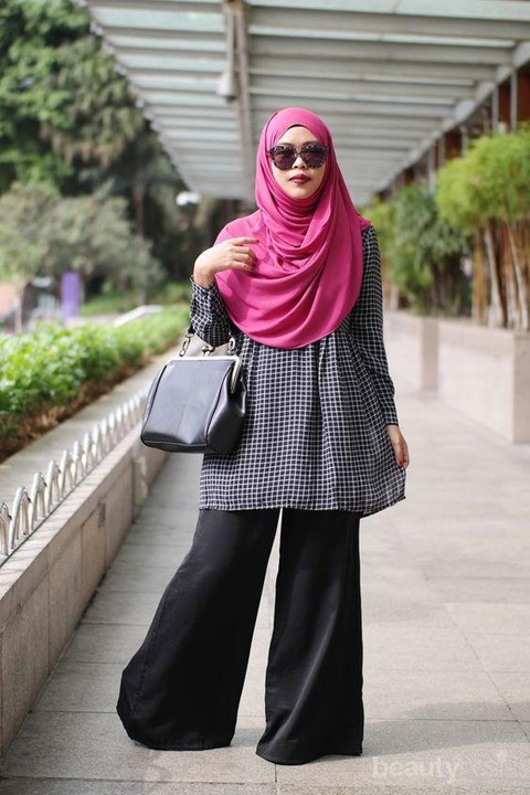Untuk kamu hijabers bertubuh gemuk, you can simply choose a basic shirt dengan warna hitam. Atasan ini merupakan atasan yang simple dan mudah didapatkan di berbagai toko. Selain itu, karena kesederhanaannya, atasan ini juga membuat tampilan kamu tidak berlebihan. And that is the point! Untuk kamu yang bertubuh gemuk, coba kenakan atasan yang simple tanpa banyak details dan pattern. Remember, less is more!