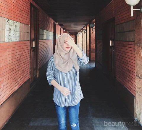 Kemeja dengan basic yang dipadukan dengan hijab warna natural seperti nude akan menghasilkan style kasual yang minimalis dan kekinian. Nasreen memadukan warna baby blue dan nude untuk nuansa lembut dan natural.