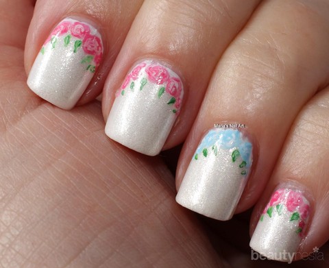 Nail art berwarna putih dengan glitter silver, dihiasi bunga berwarna pink dan biru hanya pada bagian atas kuku. Terlihat cantik, simple dan elegan.