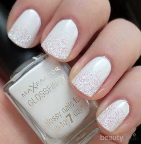Nail art warna putih dan ditaburi glitter yang memberi efek kilau. Simple dan cocok digunakan saat acara pernikahan dengan tema putih.