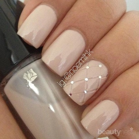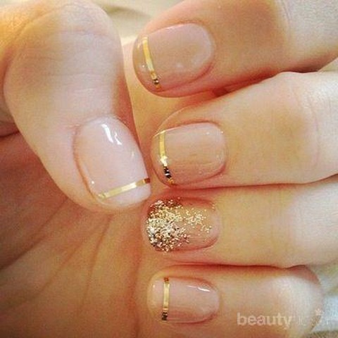 Nail art berwarna nude ini menjadi lebih glamor dengan sentuhan garis dan glitter emas di atasnya. Jangan lupa untuk kenakan top coat untuk membuat tampilannya lebih mengkilap.