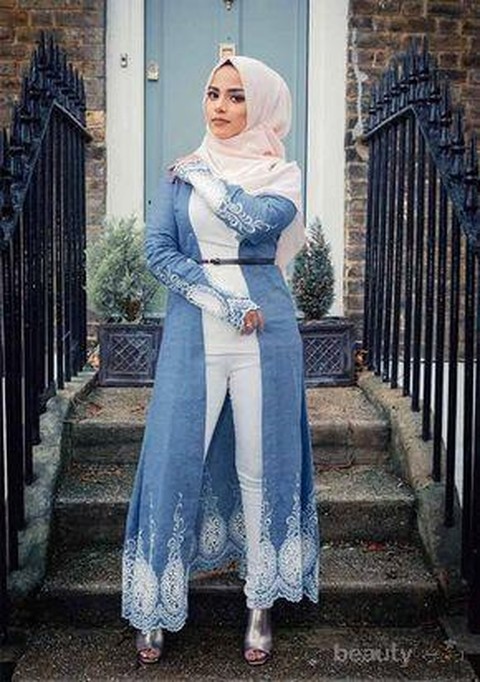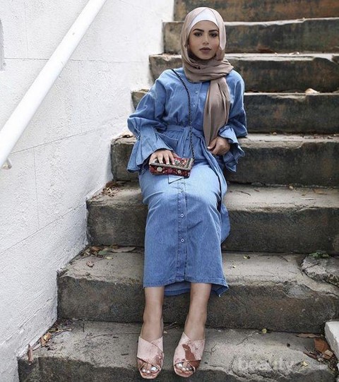 Hijab style fashion dengan padu padan denim yang cocok untuk digunakan saat kondangan adalah gamis berbahan denim. Meskipun bahan denim identik dengan tampilan casual dan santai, model gamis denim sangat tepat untuk kamu gunakan sebagai referensi tampilan hijabers saat kondangan. Kamu hanya perlu memadukannya dengan heels dan clutch kesayanganmu.