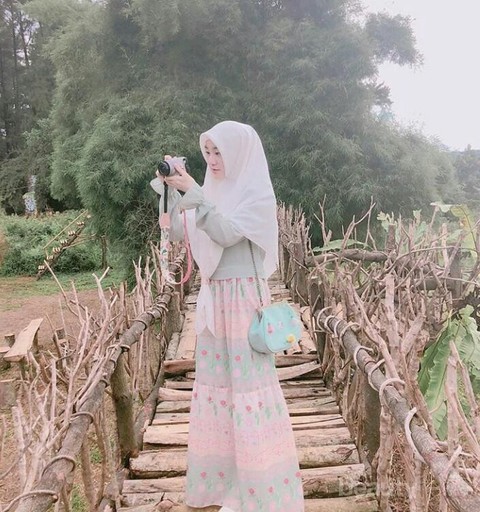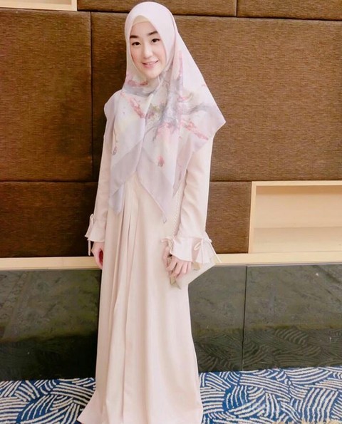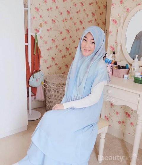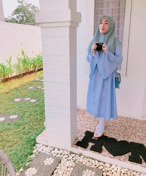 Wanita cantik berhijab yang sudah dikaruniai satu anak ini tampil seperti remaja dengan padu padan dress berdetail lengan lonceng dan stocking wudhu. Padu padan warna biru pastel untuk style ini membuat Larissa semakin terlihat awet muda dan cantik. Setuju, kan?
