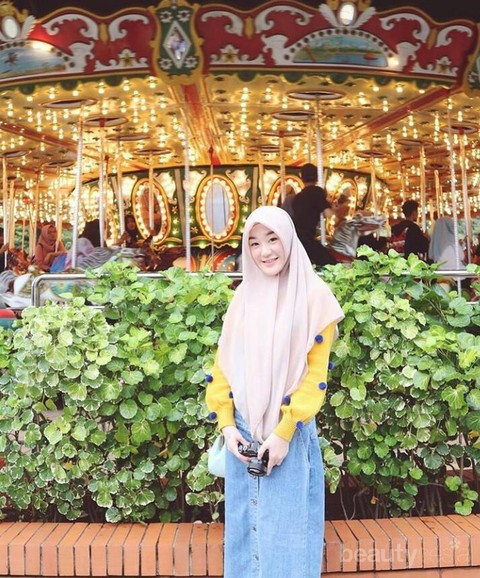 Nah, kalau tampilan Larissa saat pergi ke taman bermain bersama suami yang satu ini pasti bikin para remaja ingin tampil dengan gaya syar'i juga. Style hijab menutup dadanya tidak menghalangi style manis dengan padu padan rok denim kancing dan sweater polkadot berwarna kuning biru ini. Larissa terlihat awet muda banget, ya!
