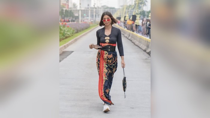Ia memadukan kain jarit dengan atasan hitam berdetail lengan balon dan garis leher kotak. Di atas stagen, ia memakai korset yang membuat tampilannya lebih seductive. Sangat kekinian, tetapi juga tak dipungkiri ada gaya kebaya tradisional yang tetap dipertahankan.