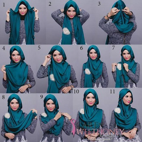 Kali ini kamu tak perlu meyematkan jarum pentul di bagian leher ya ladies. Kamu hanya cukup Mellipat bagian sisi lain hingga ke atas kepala hanya dengan satu jarum. Biarkan sisi panjang yang tersisa agar meberikan kesan layering seperti rambut.