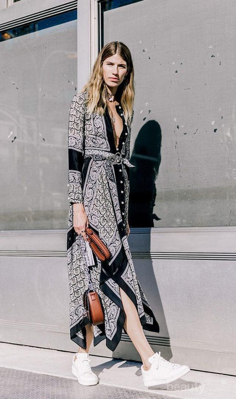 Perpaduan antara dress dan sepatu sneakers bisa memberikanmu gaya ala musim panas yang sangat menarik lho. Kamu bisa menggunakan