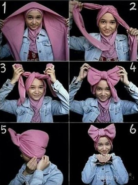 Satu lagi tutorial hijab pashmina yang sedang hits, yaitu model turban pita. Berikut caranya: