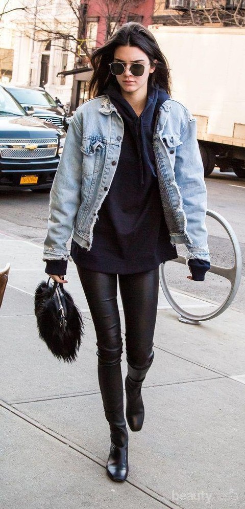 Kini kamu bisa banget lho mencontek gaya kece supermodel Kendall Jenner. Kendall tampil terlihat kece banget memadupadankan jaket jeans-nya dengan boots warna hitam. Adik dari Kim Kardashian ini lantas menyempurnakan penampilannya dengan menggunakan sweater warna navy.