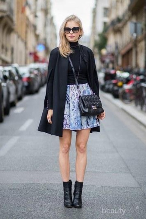 Untuk acara sore hari kamu bisa menggunakan turtleneck hitam dengan printed skirt. Padu padan ini akan membuat tampilan jadi lebih berwarna. Kenakan ankle boots untuk membuat kaki terlihat lebih jenjang.