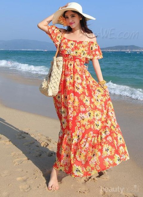 Kamu bisa tampil tertutup dengan maxi dress bermotif. Pastinya nyaman dan kamu akan terlihat stylish saat main di pantai.