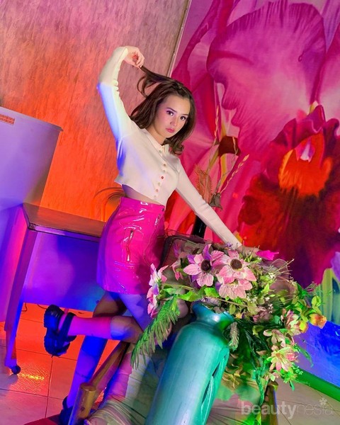 Inspirasi mix and match pertama datang dari artis muda multitalenta, Beby Tsabina. Tampilannya nggak main-main nih, Beby berani memadupadankan rok warna violet dengan efek mengkilat dengan crop top warna putih lengan panjang dengan aksen kancing. Look ini mampu membuatmu tampil segar dan cheerful, lho. Boleh banget dicoba.