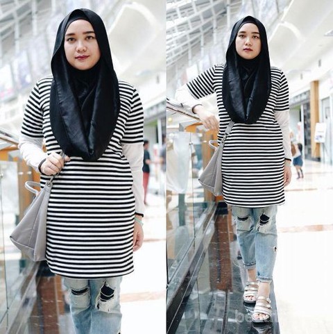 Buat kamu para hijabers yang bertubuh gemuk dan ingin menggunakan ripped jeans bisa banget kok ladies. Lihat saja bagaimana cara selebgram Suci Utami memadu padankan ripped jeans dengan atasan stripes yang membuatnya makin kece.