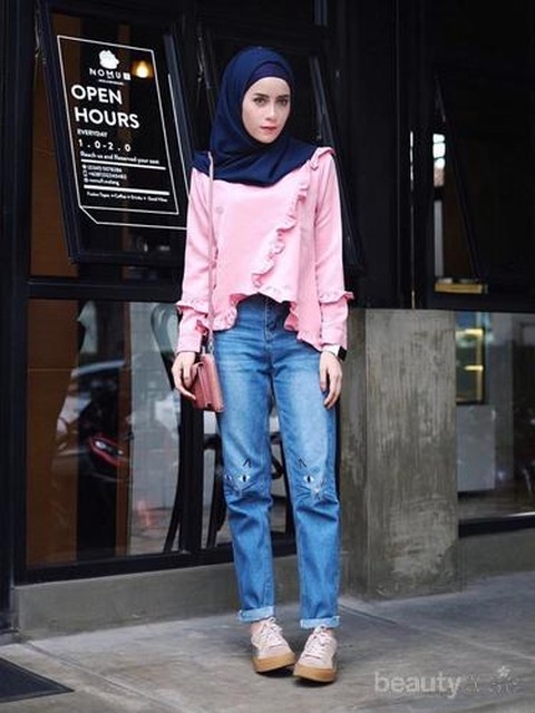 Selebgram hijab Aghnia Punjabi tampil keren dengan menggunakan cuffed jeans yang dipadukan dengan blouse warna pink serta sneakers. Agar melengkapi penampilannya, ia memilih untuk menggunakan hijab polos yang simpel namun tetap terlihat keren kan ladies.