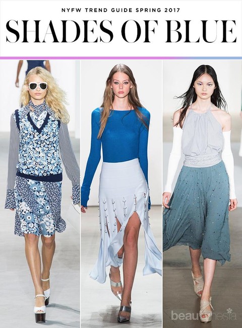 Biru adalah warna netral yang nyaman untuk dipandang lama-lama. Oleh karena itu, ada baiknya di tahun 2017 kalian mulai mengoleksi pakaian berwarna biru. Warna biru juga cocok untuk tema apapun sehingga tentunya mengoleksi warna ini tidak akan membuang-buang uang. Baju di bawah adalah contoh dari Michael Kors, Prabal Gurung dan Jill Stuart.