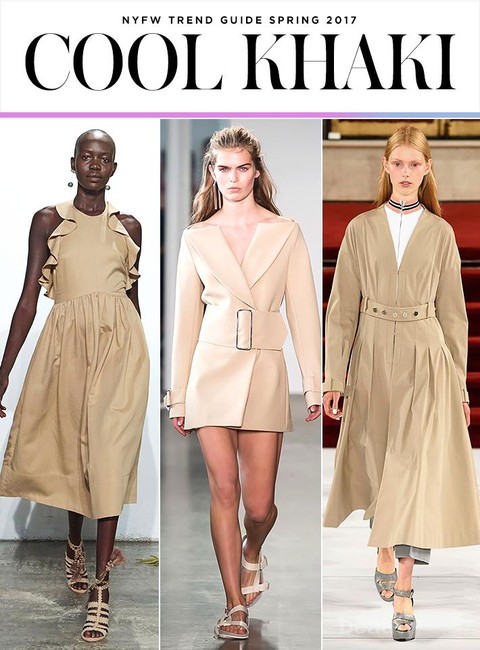 Warna beige yang mendadak menjadi sangat populer sejak digunakan oleh Kim Kardashian akan tetap menjadi populer pada tahun 2017. Warna netral lainnya juga akan menjadi warna favorit semua brand baju mahal. Warna khaki akan memberikan kesan elegan dan classy pada tubuh. Selain itu, warna ini cocok untuk digunakan pada undertone apapun sehingga tentunya warna ini menjadi koleksi wajib di tahun 2017. Contoh baju di bawah berasal dari Ulla Johnson, dan Creatures of the Wind.
