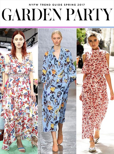 Tren yang satu ini cocok sekali untuk kita yang tinggal di negara tropis. Baju bertema garden party ini identik dengan suasana cerah hangat pada saat bunga-bunga bermekaran, Baju ini sendiri berkesan sangat feminin dengan print floral sebagai fokus utama. Baju tema ini biasanya memiliki bagian lengan yang mengembang, panjang menyentuh mata kaki, ataupun jumpsuit yang bagian bawahnya mengembang. Baju seperti model di bawah merupakan baju dari Tanya Taylor, Tibi dan Lela Rose.