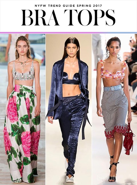 Hampir sama dengan crop tee hanya saja top ini dalam bentuk bra. Bagi kalian pecinta crop tee bisa mencoba bra top ini untuk tampilan yang lebih menantang. Selain seksi, tampilan ini memberikan kesan fresh dan tahun baru dengan musim semi yang cerah. Bra top ini biasanya dipasangkan dengan rok, cropped jeans, slinky suits, dan apapun itu yang kalian rasa cocok. Contoh baju di bawah dari Tory Burch, Victoria Beckham dan Altuzarra.