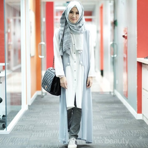 Foto: https://style.tribunnews.com/Tampil simpel dengan perpaduan tunik dan long vest dengan basic pants. Nuansa abu-abu putih membuat Alyssa terlihat elegan dan simpel.