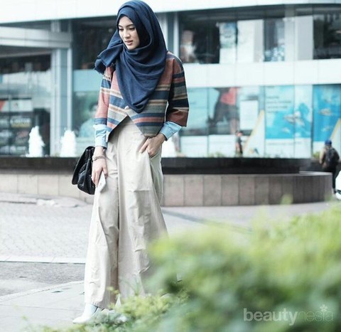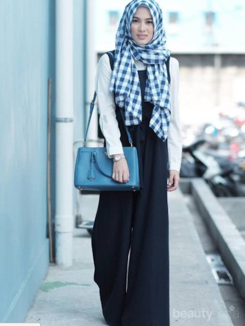 Foto: https://www.bintang.com/Jumpsuit dark navy sangat serasi dengan pashmina kotak-kotak biru putih. Alyssa terlihat sangat manis dengan style ini.