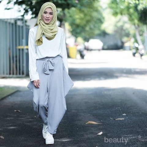 Foto: https://style.tribunnews.com/Harem style abu-abu pastel dipadukan dengan pashmina hijau pastel bukanlah hal yang buruk. Dua warna lembut ini terlihat sangat serasi dipadukan dengan shirt putih.