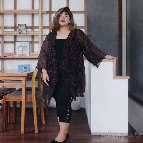 Foto: IstimewaUntuk kamu yang berbadan plus size, pasti akan sering memilih outfit dengan warna gelap. Tujuannya untuk memberikan kesan lebih langsing daripada sebelumnya. Tira membagikan outfit serba hitam yang memberikan kesan kasual. Ia menambahkan outer dengan warna yang sama dengan polkadot warna merah.