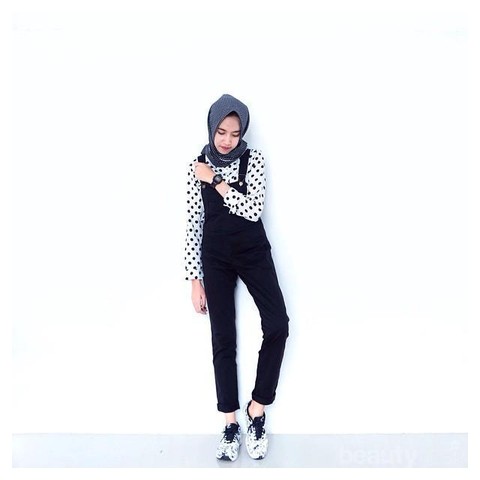 Amelia Elle menyukai pakaian dengan motif polkadot. Hampir di setiap fotonya, ia menggunakan outfit dengan motif polkadot. Kali ini ia memakai kaos yang dipadukan dengan overall berwarna hitam, simple style! Sedikit tips, untuk kamu yang memiliki postur tubuh gemuk, sebaiknya hindari pakaian ini karena hanya akan mempertegas bentuk tubuhmu saja, ladies!