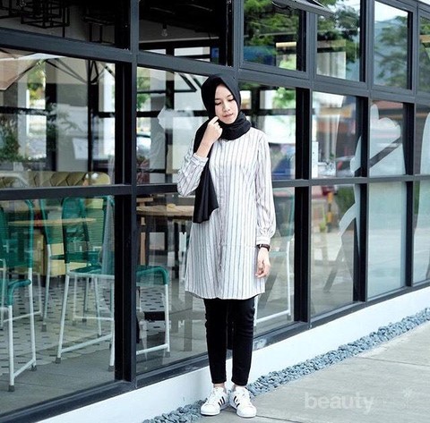 Gadis cantik ini memadu padankan blouse stripe oversize putih selutut dengan celana jeans berwarna hitam sebagai bawahannya. Untuk hijab, ia memilih pashmina dengan model sederhana. Style casual ini dilengkapi dengan sepatu sneakers berwarna putih. Outfit seperti ini bisa kamu kenakan saat hang-out bersama teman-teman ataupun pergi ke kampus.