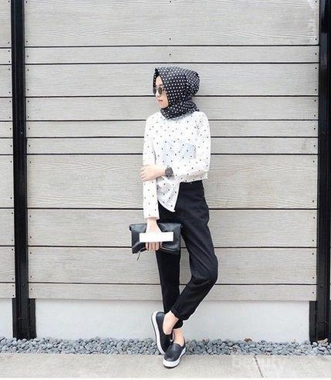 Yuk bongkar isi lemarimu! Inspirasi gaya monokrom Amelia Elle berikut ini cukup simple. Terlihat sangat casual dan cocok dikenakan untuk kuliah. Ia mengenakan kemeja motif polkadot kecil yang di padukan dengan hijab motif polkadot juga. Sebenarnya, ia melakukan tabrak motif pada pakaiannya ini, tapi tetap terlihat eyecatching selama pemilihan motif dan warnanya tepat. Untuk kamu yang butuh inspirasi fashion hijab untuk pergi ke kampus, kamu bisa meniru gaya Amelia ini.