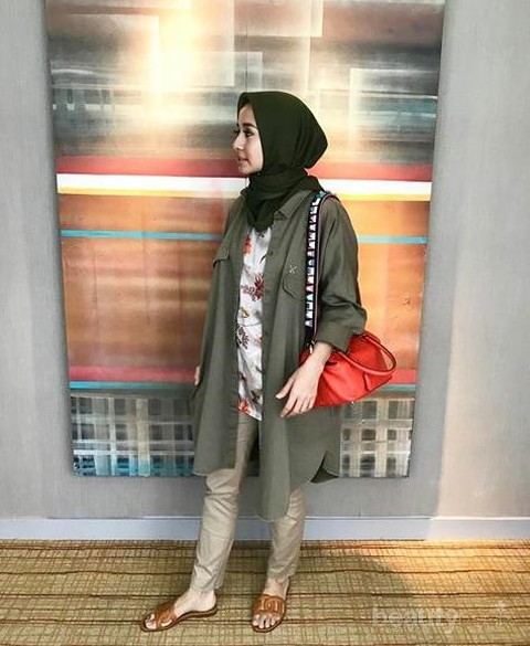 Menjadikan kemeja sebagai outer? Why not! Alternatif gaya dengan kemeja ini bisa bikin gaya casual kamu makin kece lho. Coba deh pakai over-sized shirt kamu sebagai outer dan padukan dengan t-shirt dan jeans seperti yang diaplikasikan hijabers cantik satu ini. Pasti gaya kamu bakal sekeren Laudya Cynthia Bella deh, ladies.