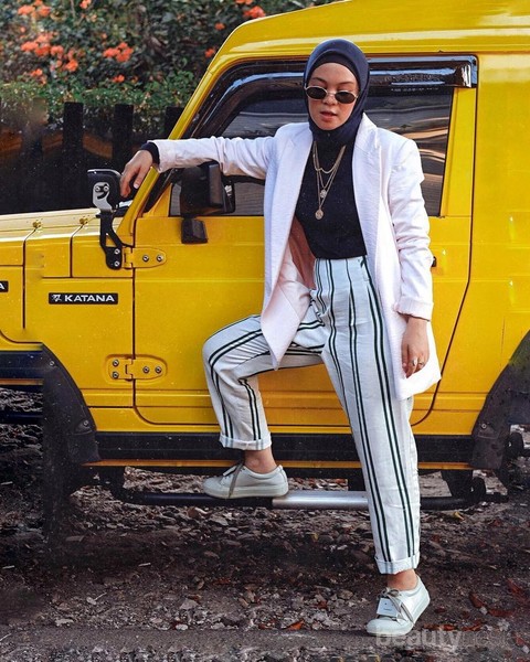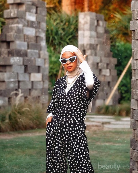 Berbeda dengan dua style sebelumnya, istri Haykal Kamil ini tampil dengan satu warna dalam gayanya. Kali ini dia terlihat santai dengan