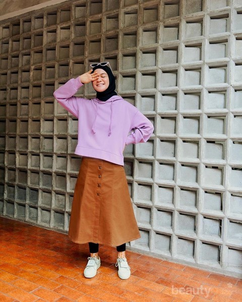 a-line skirt. Di dalamnya ia masih mengenakan legging hitam