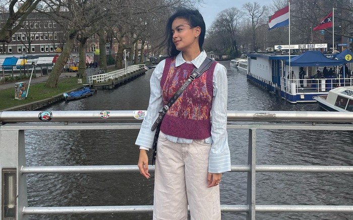 Saat cuaca lebih hangat di Belanda, sweater vest bercorak jadi andalan istri dari Demas Narawangsa, Beauties. Motif dari knitwear maroon itu sengaja ditabrakkan dengan kemeja bergaris dalam warna biru yang lembut. Celana baggy beige dan sepasang Adidas turut menyempurnakan gaya kasualnya.