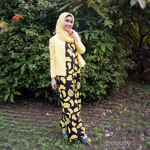 Kasual dan colorful gaya Annisa kali ini mengenakan banana printed dress, yang sangat cocok digunakan untuk kegiatan santai seperti hangout bersama sahabat. Dipadankan dengan blazer berwarna senada, look ia kali ini nampak fresh dan cantik. Mau coba gaya ala Anisa, ladies?