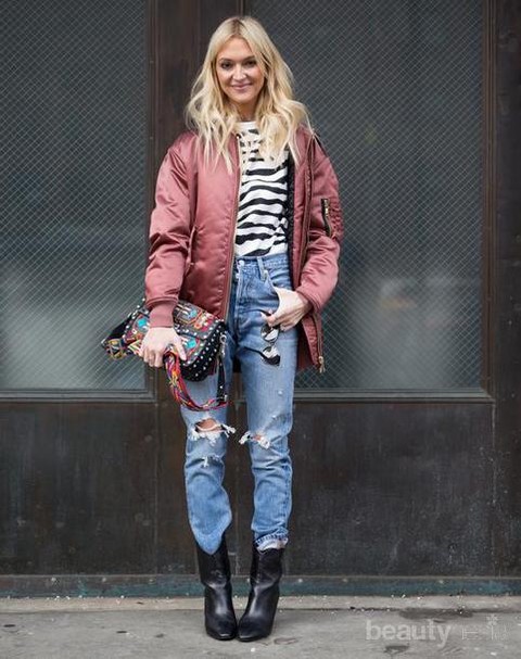 Buat kamu yang lebih menyukai gaya yang edgy, kamu bisa mengombinasikan ripped jeans dengan bomber jacket. Untuk dalaman, kamu cukup menggunakan kaos dengan motif kesukaanmu. Motif garis-garis terlihat cantik dipadukan dengan bomber jacket berwarna cerah. Agar penampilanmu semakin edgy, kamu bisa menambahkan sepatu boots atau sekedar ankle boots agar penampilan kamu semakin maksimal.