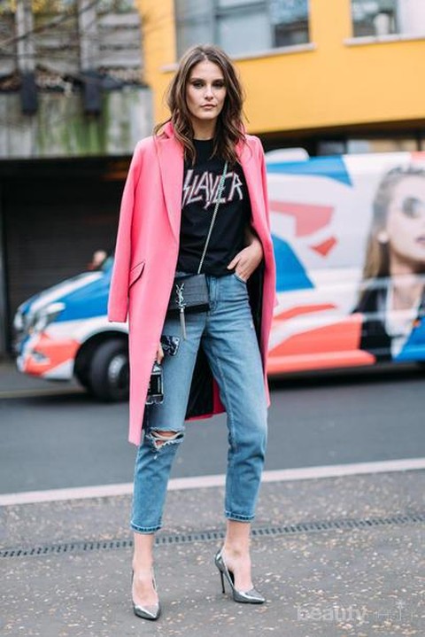 Gaya yang satu ini bisa bikin kamu fashionable banget. Kamu bisa memadukan ripped jeans dengan kaos kesukaanmu, kemudian tambahkan coat panjang sebagai outer. Jika kamu ingin bermain dengan warna, kamu bisa menggunakan kaos band berwarna hitam dan dipadukan dengan coat berwarna cerah seperti warna pink contohnya. Agar penampilanmu lebih maksimal, kamu bisa menggunakan high heels untuk menyempurnakan penampilanmu.