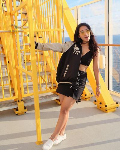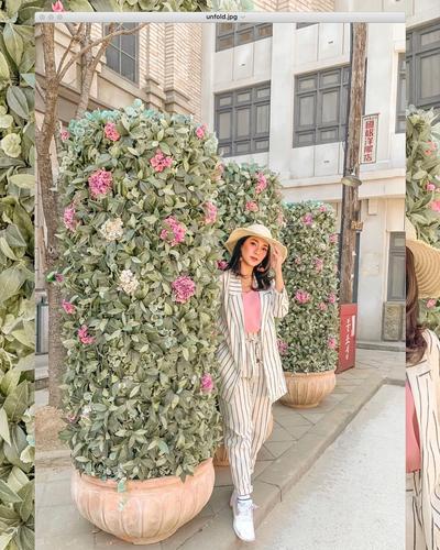 One set suit tidak hanya diperuntukkan untuk mendatangi acara formal. One set suit juga bisa dijadikan pilihan untuk outfit liburan kamu. Dinda mengenakan one set suit dengan motif garis vertikal, ini merupakan tips agar kamu terlihat lebih langsing. Dinda juga pintar dalam hal mix and match, ia mengenakan inner berwarna peach. Ide memasukkan inner ke dalam celana memberikan kesan kamu terlihat lebih tinggi. Tidak ketinggalan, Dinda menggunakan aksesoris berupa topi. Kali ini Dinda memilih topi fedora rajut untuk menunjang penampilannya. Sama seperti OOTD sebelumnya, Dinda nggak bisa jauh-jauh dari yang namanya sneakers sebagai pelengkap casual look-nya.